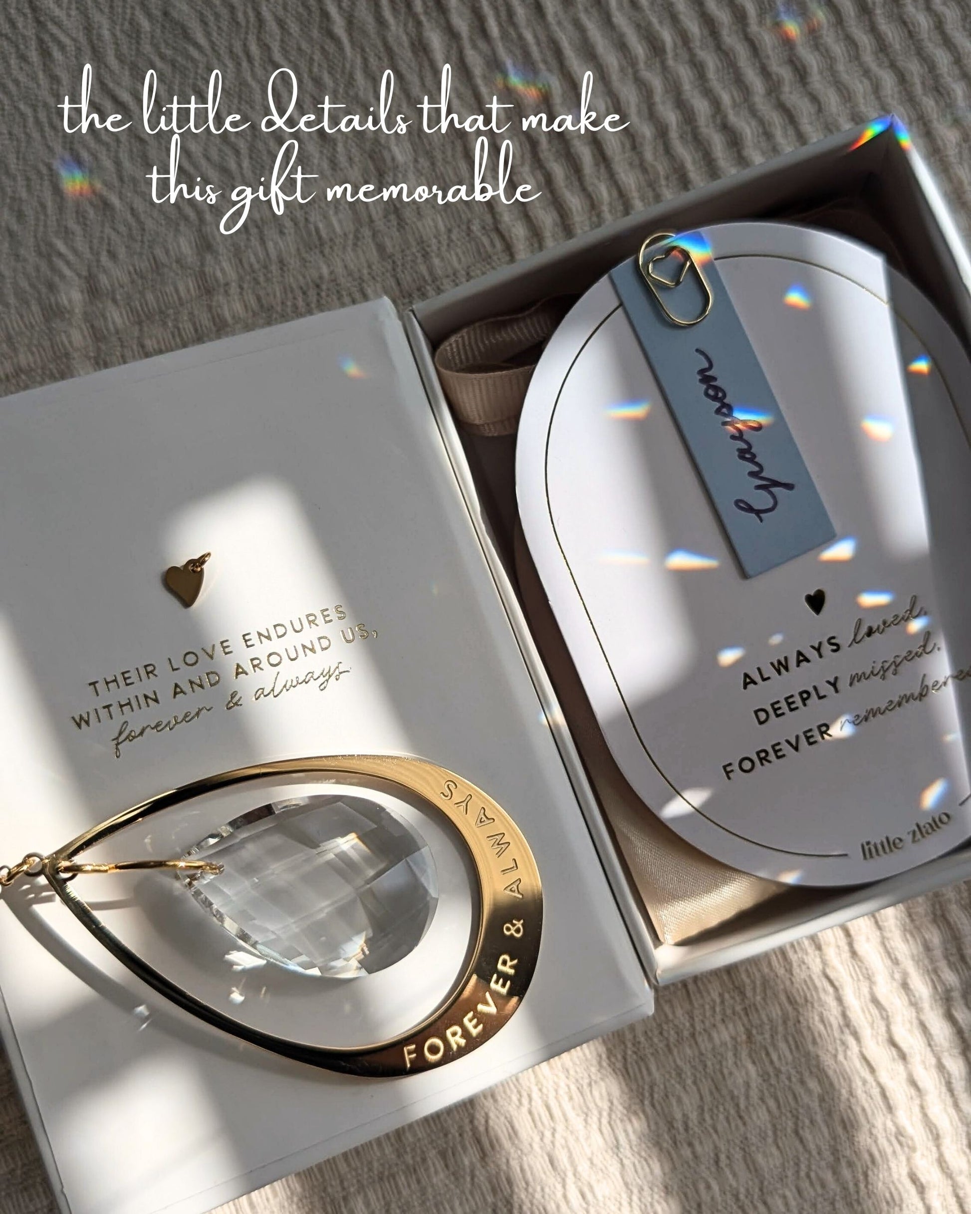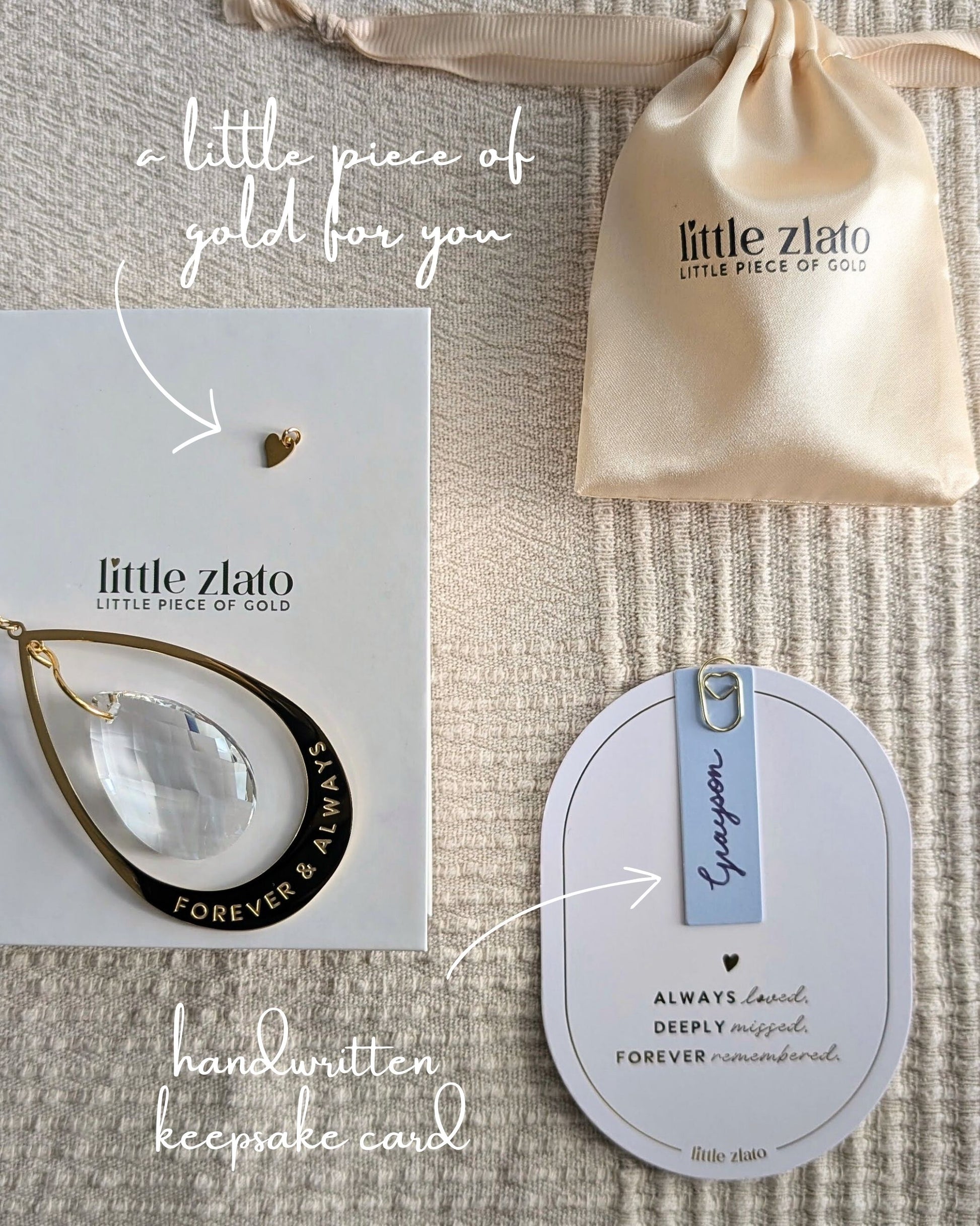 Each Little Zlato piece is designed to be a lasting memorial, assembled and packaged with the utmost care. If your suncatcher arrives damaged or with an issue, please reach out right away and we’ll make it right. With gentle care, your Lightkeeper is made to shine for years to come — a keepsake of love, forever & always.